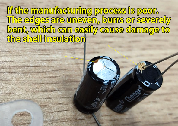 - The high-voltage side of an electrolytic capacitor‘s leads is made of thin steel sheets. If manufacturing quality is poor—such as uneven edges, burrs, or sharp bends—the sharp points can cause partial discharge. This discharge can break down the oil, cause the casing to expand, and lower the oil level, leading to insulation failure. Additionally, if the corner welds are overheated during sealing, it can damage internal insulation, producing oil stains and gas, drastically lowering voltage and causing failure.
