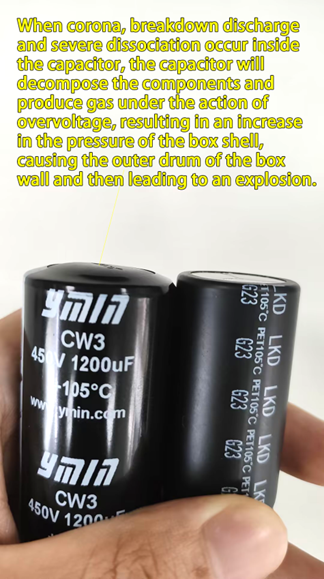 - When partial discharge, dielectric breakdown, and severe ionization occur inside the capacitor, the overvoltage reduces the starting ionization voltage below the working electric field strength. This triggers a series of physical, chemical, and electrical effects, accelerating insulation degradation, gas production, and creating a vicious cycle. The increasing internal pressure causes the capacitor shell to bulge and potentially explode.