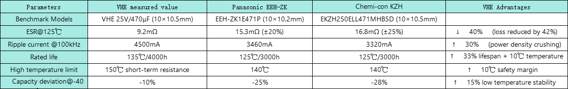 A: The VHE series is an upgraded version of the VHU, featuring lower ESR (9-11mΩ vs. VHU), 1.8 times higher ripple current capability, and higher temperature resistance (supporting 150°C ambient).