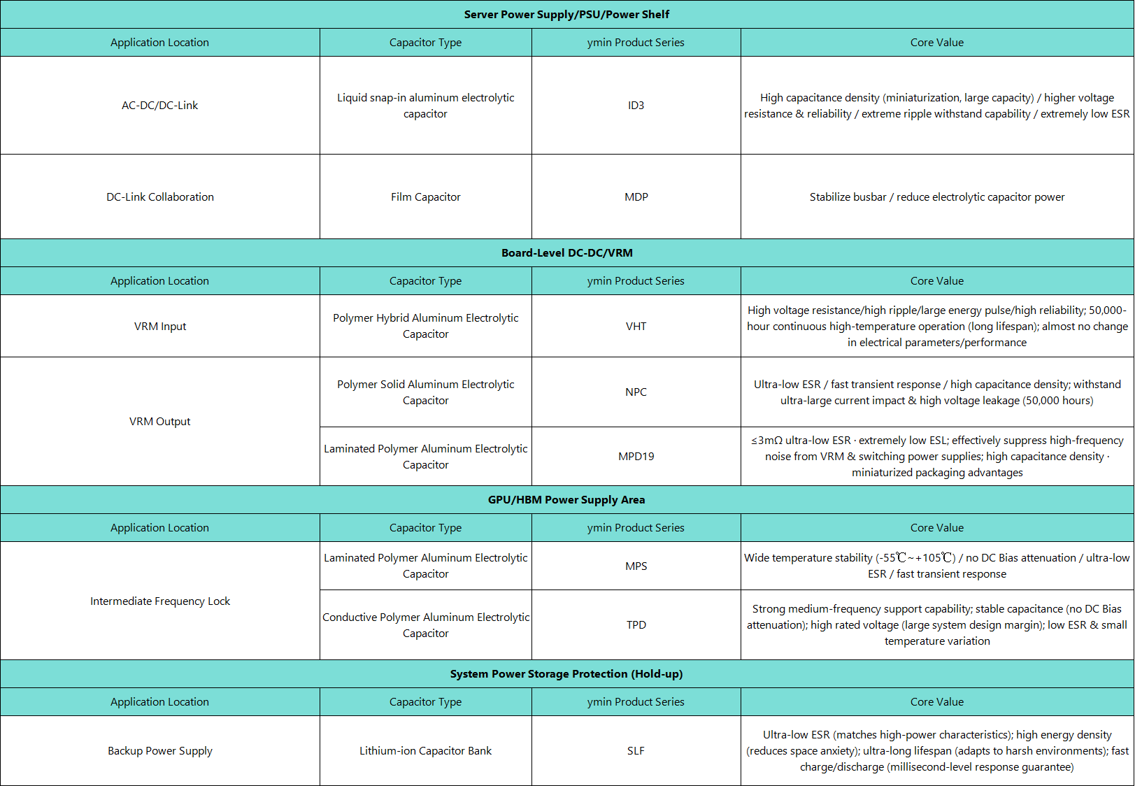 YMIN provides a complete capacitor solution covering “power supply → board level → GPU → system backup”: