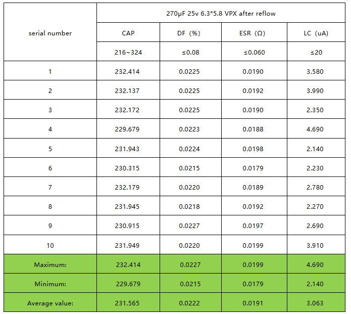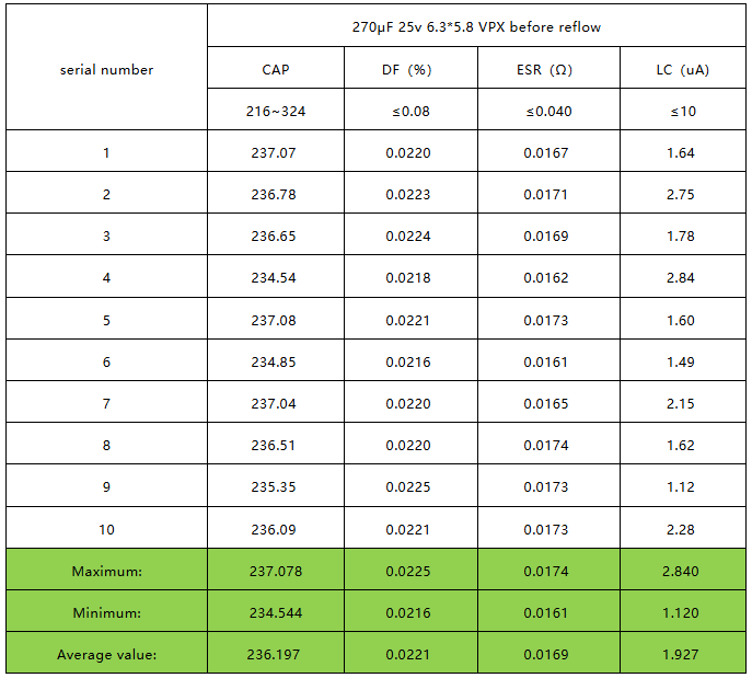 The following is the leakage current data of the 270μF 25V specification before and after reflow solderingContrast (leakage current unit: μA):